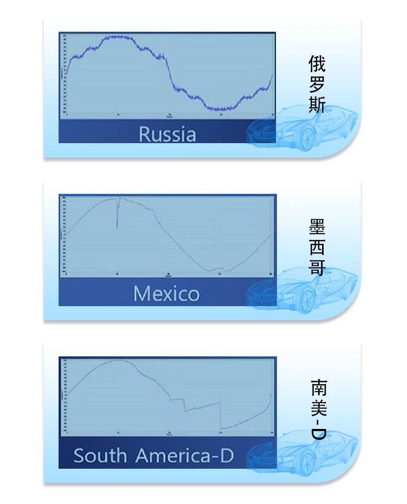 深圳某新能源車企為了推進全球化市場,需要對OBC進行多國電網(wǎng)適應(yīng)性測試,但俄羅斯、墨西哥、南非等國家測試工況較為嚴苛,普通的測試電源無法編輯較為復(fù)雜的電網(wǎng)波形。以下為部分標(biāo)準(zhǔn)波形:
